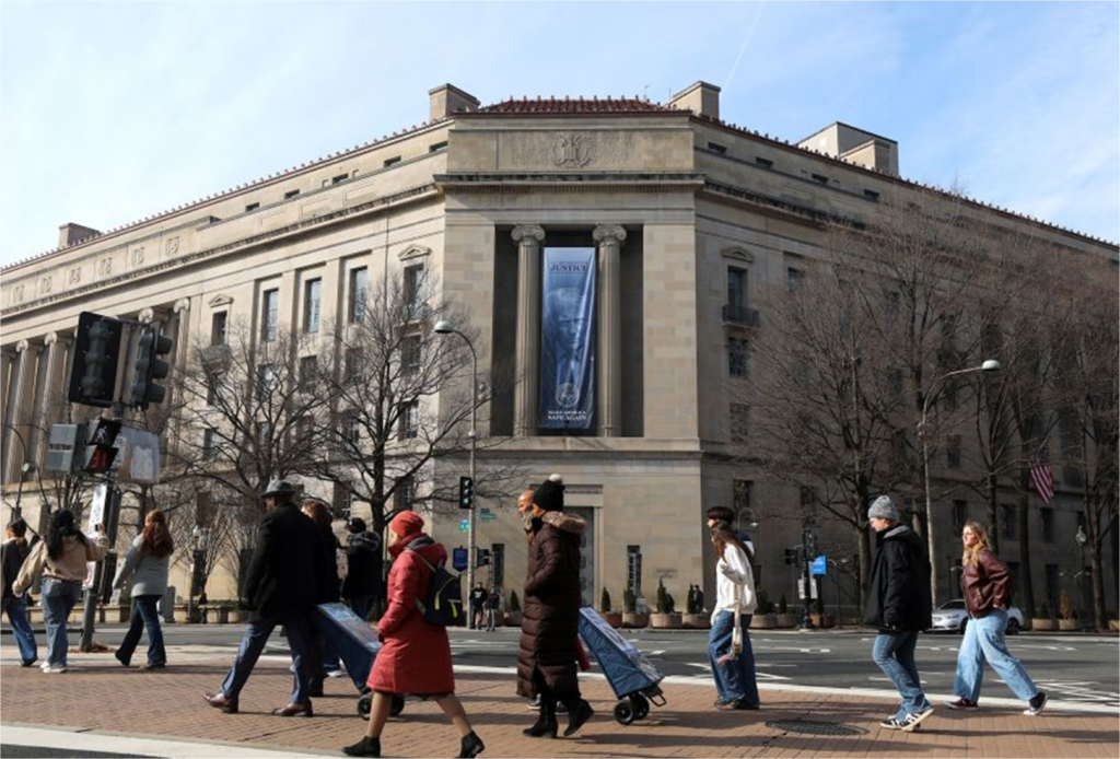 ২০২৬ সালের ২৭ ফেব্রুয়ারি, ওয়াশিংটন ডিসিতে বিচার বিভাগের সামনে দিয়ে পর্যটকরা হেঁটে যাচ্ছেন।